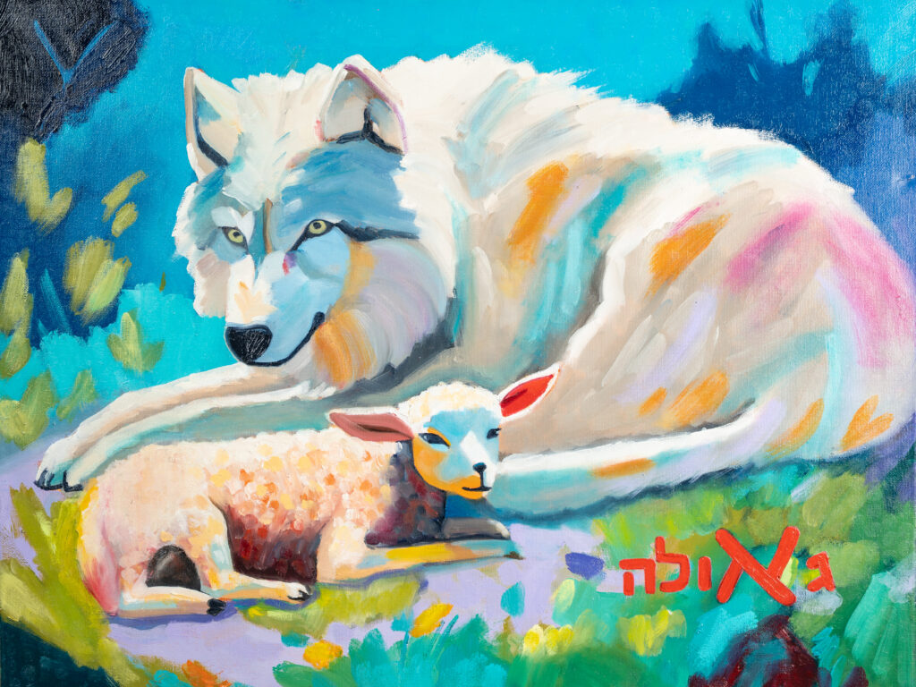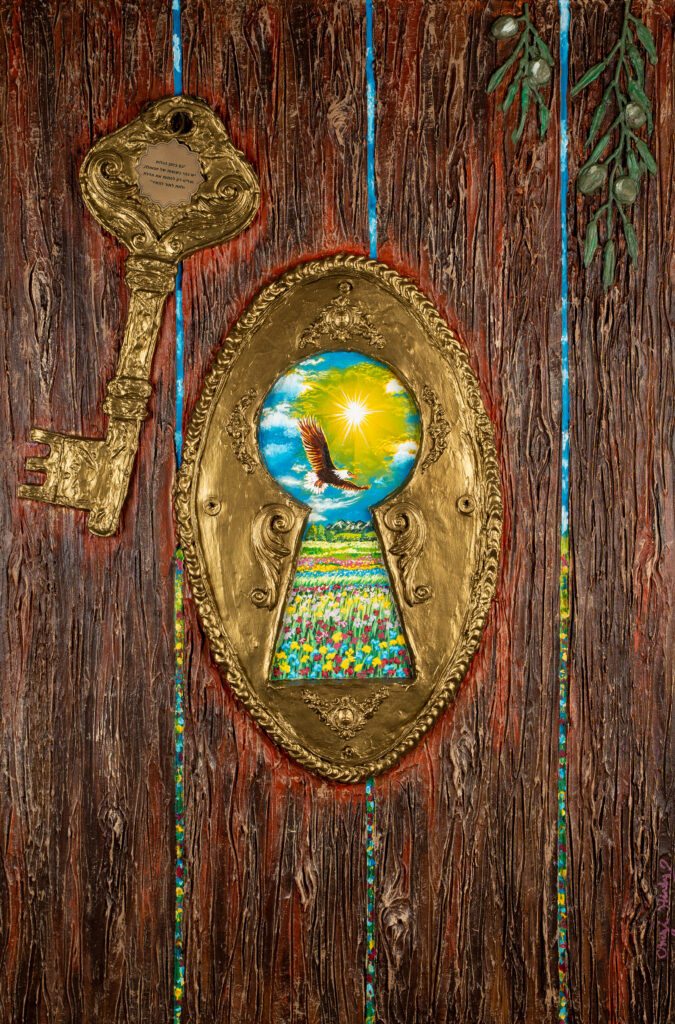 Chassidus Idea: This piece explores the quiet tension between concealment and revelation. Redemption doesn’t destroy exile—it transforms it. Even within darkness, sparks of Geula already exist. We need only open the door and let the light in. A weathered door stands before us—marked by sorrow, time, and story. Yet its cracks do not conceal; they invite. Through the keyhole, a burst of light reveals a radiant garden, a soaring eagle, the promise of redemption not beyond the door, but within it. The worn key nearby speaks of memory and potential. Above, olive branches descend—symbols of resilience and hidden light, like the oil of the Menorah. Geula is not distant. It’s here—shining through the cracks, waiting to be revealed.